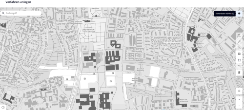 Zum Anlegen neuer Verfahren klicken Sie auf den Reiter VERFAHREN ANLEGEN. Es öffnet sich eine neue Seite mit Formularfeldern und einer Kartenansicht. Auf dieser Seite werden die wesentlichen Stammdaten eines Planverfahrens abgefragt, die zwingend notwendig sind.
