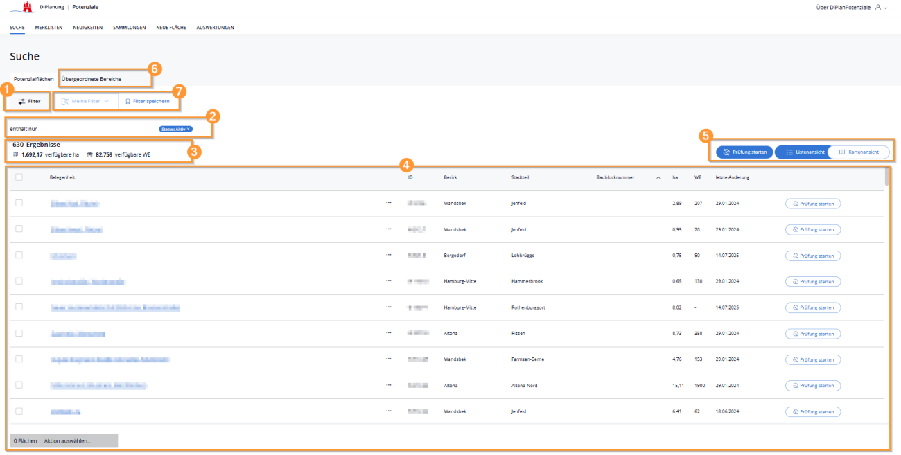 In der Anwendung werden nicht nur Potenzialflächen gespeichert, sondern auch sogenannte "übergeordnete Flächen", also Konversionsflächen und gewerbliche Standorte. Diese wiederum können Potenzialflächen enthalten. Um diese übergeordneten Flächen aufzurufen, kann die Suche umgestellt werden (6).