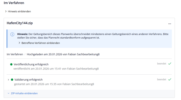 Beim Veröffentlichen eines Planwerks wird außerdem geprüft, ob sich der Geltungsbereich des Planwerks mit einem andern Planwerk überschneidet. Ist dies der Fall, so werden die betroffenen Verfahren verlinkt: