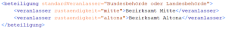 Unterhalb der Verfahrenssteuerung und einmal eingerückt folgen die Angabe der Veranlasser für die Beteiligung sowie die gewünschten Planarten und Verfahrensarten für die VK. Die Beteiligung ist verpflichten mit einem "StandardVeranlasser" anzugeben. Optional können weitere Veranlasser mit einer Zuständigkeit angegeben werden. Beim Nachrichtenaustausch mit DiPlanBeteiligung wird geprüft, ob ein spezifisch zur Zuständigkeit passender Veranlasser vorhanden ist. Wenn ja, wird dieser übermittelt, andernfalls der Standard-Veranlasser ohne Zuständigkeit.