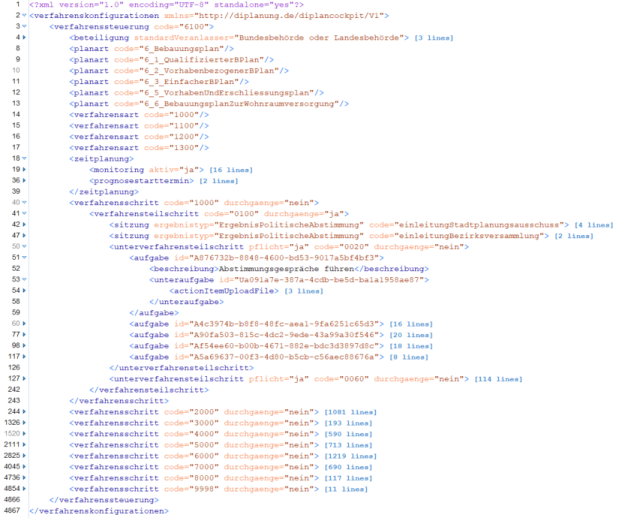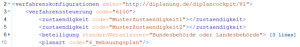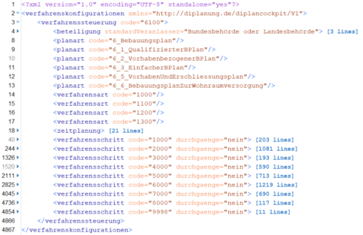 Hinweis: Neben dem Code der Verfahrenssteuerung (Zeile 3) ist die Fachdomäne anzugeben, hier "KommunaleBauleitplanung" (fehlt im Screenshot). Die Zeile muss lauten <verfahrenssteuerung code="6100" fachdomaene="KommunaleBauleitplanung">